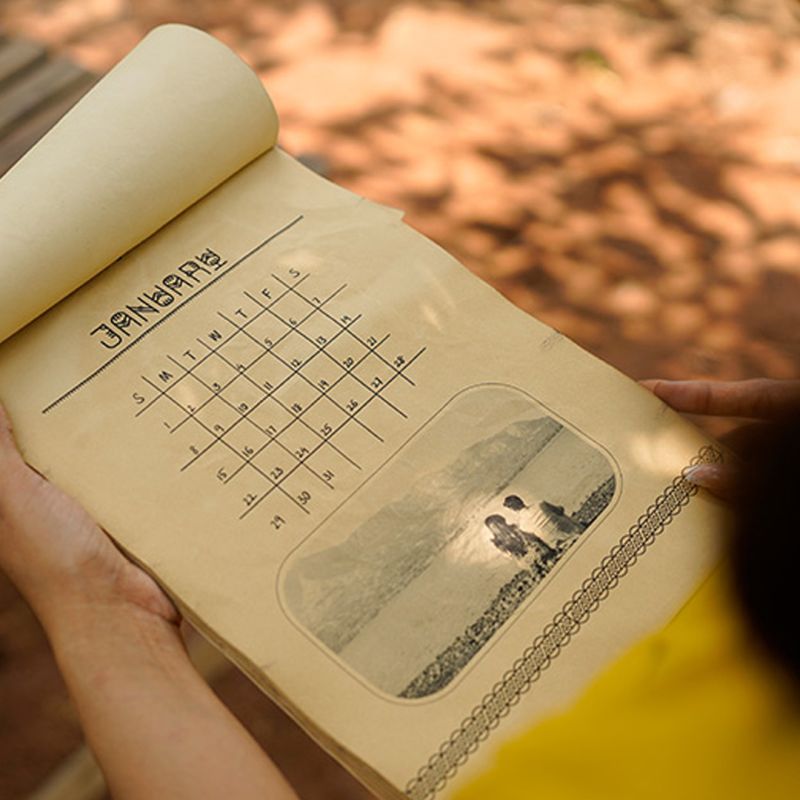 "Vintage calendar designed with ancient themed cover page, B/W pictures, and writable space.