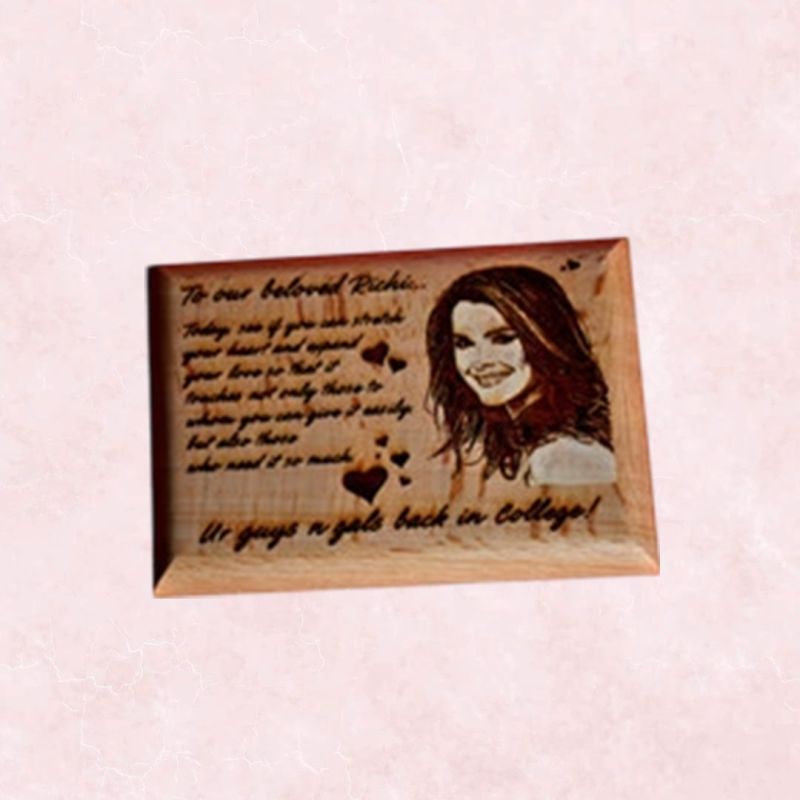 Surprise your special one on their special day with this personalized wooden plaque. This attractive wooden plaque is sure to bring a smile to the faces of your loved ones. The plaque can be customized by engraving your photos and other cherished moments of your life."