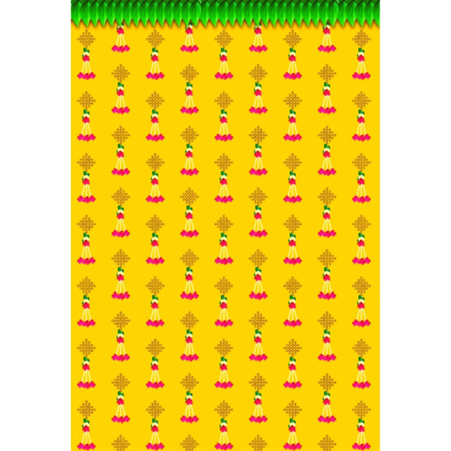 Yellow Backdrop with small muggu and flower hangings with Mavidi Thoranam 5x8 Ft